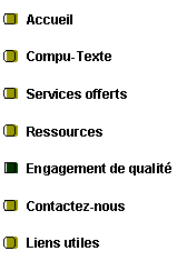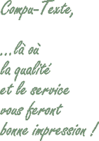 La force première de Compu-Texte est la qualité. Compu-Texte croit, en ces années de forte concurrence, que la qualité sous toutes ses formes est la seule chance de réussite. La qualité se définit par un travail sans faille, de qualité, de nature et d’allure professionnelles, exécuté par un personnel qualifié et minutieux, et ce, dans les délais convenus. Cette même qualité se résume, pour Compu-Texte, à la satisfaction de la clientèle sans condition aucune.