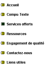 La gamme des services offerts par Compu-Texte n’est limitée que par les besoins de sa clientèle. Compu-Texte offre une gamme complète de services de traitement de texte et de secrétariat, dont : · Saisie de textes · Saisie de données · Mise en page · Correspondance · Transcription d’enregistrement · Transcription d’enregistrement de Cour et juridique · Conception de base de données · Curriculum vitae · Traduction · Publipostage · Production d’étiquettes · Feuillet publicitaire · Présentation multimédia · Impression laser couleur · Numérisation par balayage · Création/copie de CD-DVD · Conversion de fichiers · Photocopie, télécopie, télécopie de masse · Préparation et assistance pour congrès · Reliure